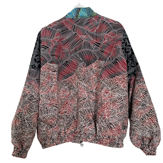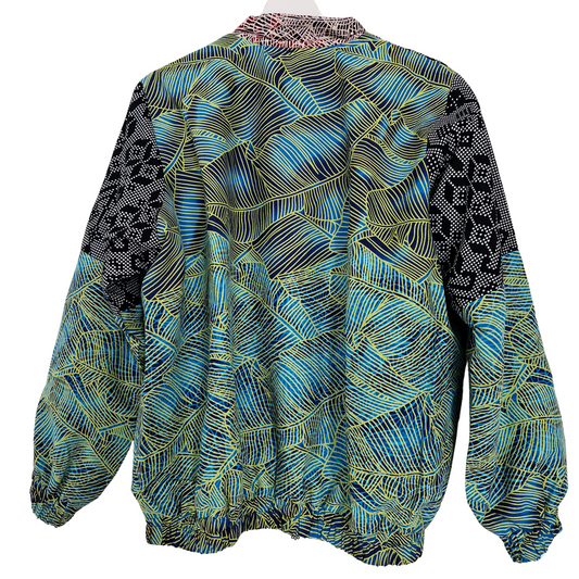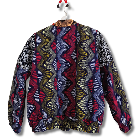 Find your unique bomber jacket made from patchwork of African print fabric.